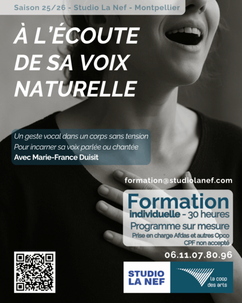 La formation individuelle de 30h « A l’écoute de sa voix naturelle. Un geste vocal ancré dans un corps sans tensions » est faite pour vous.